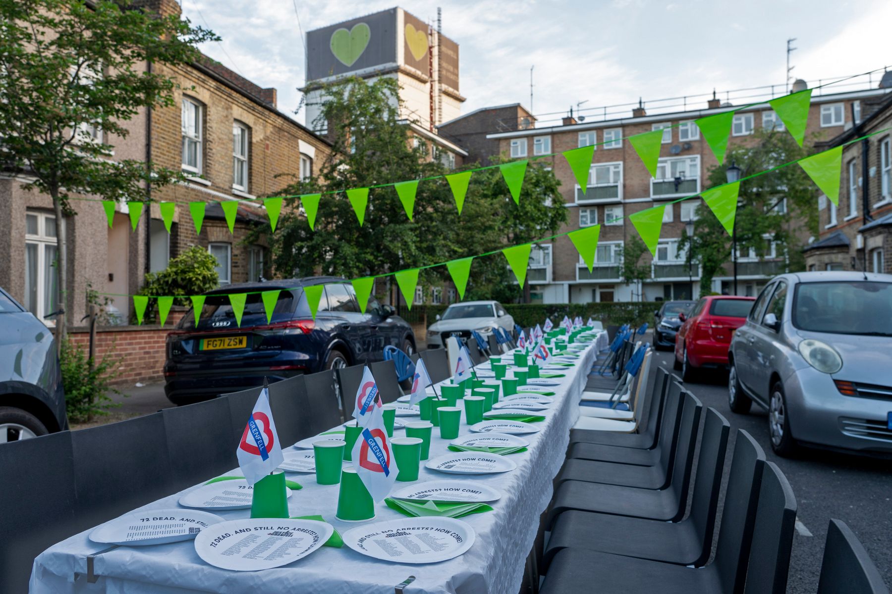 Justice4Grenfell held an empty street party ahead of the Queen's Platinum Jubilee in a protest against a lack of justice for those responsible for the fire. The campaign group set a table with 72 empty seats to represent the 72 people who died
