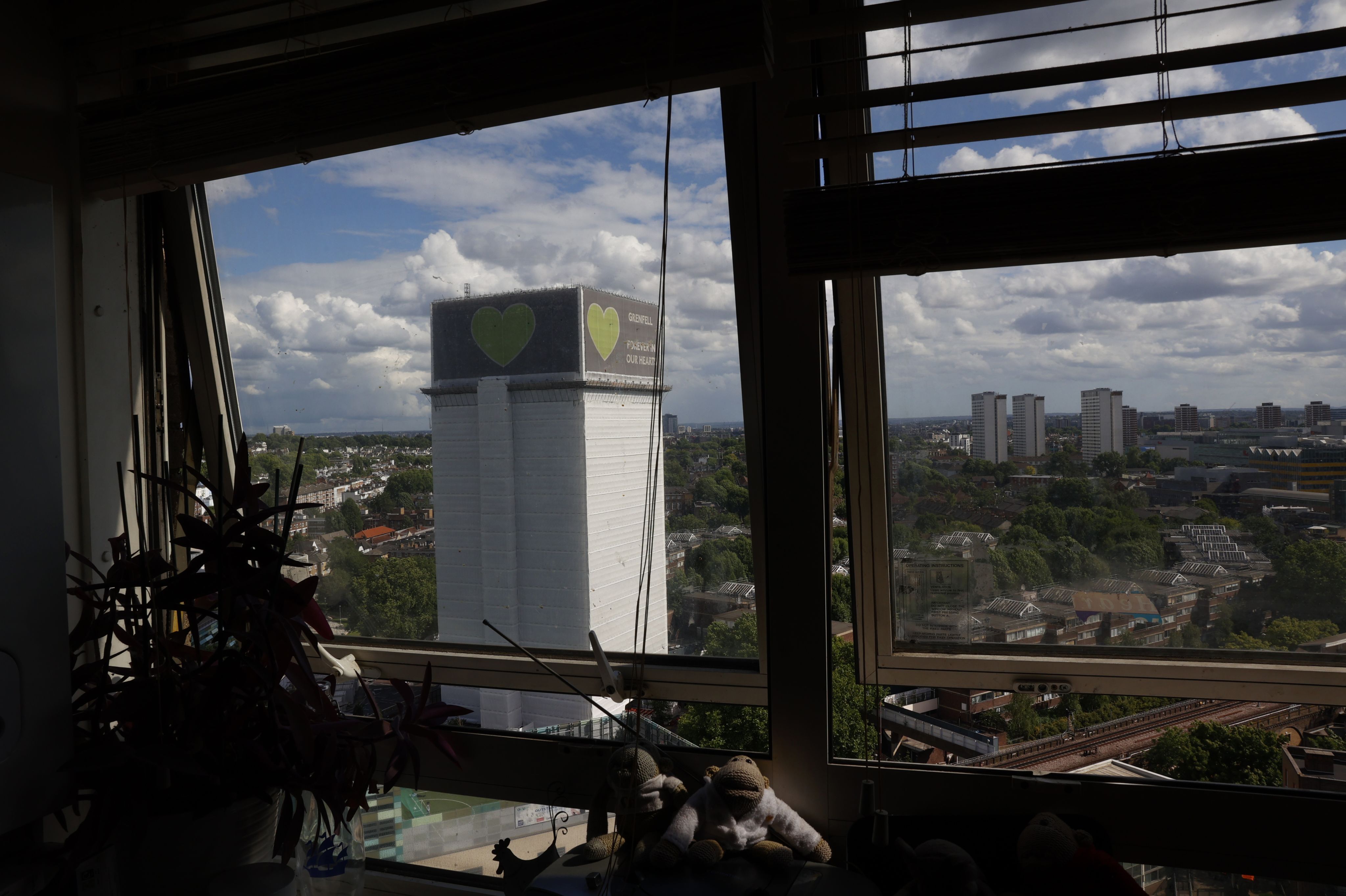 Grenfell Tower seen from a flat in a neihgbouring tower block. The impact of the fire has devastated the surrounding community.